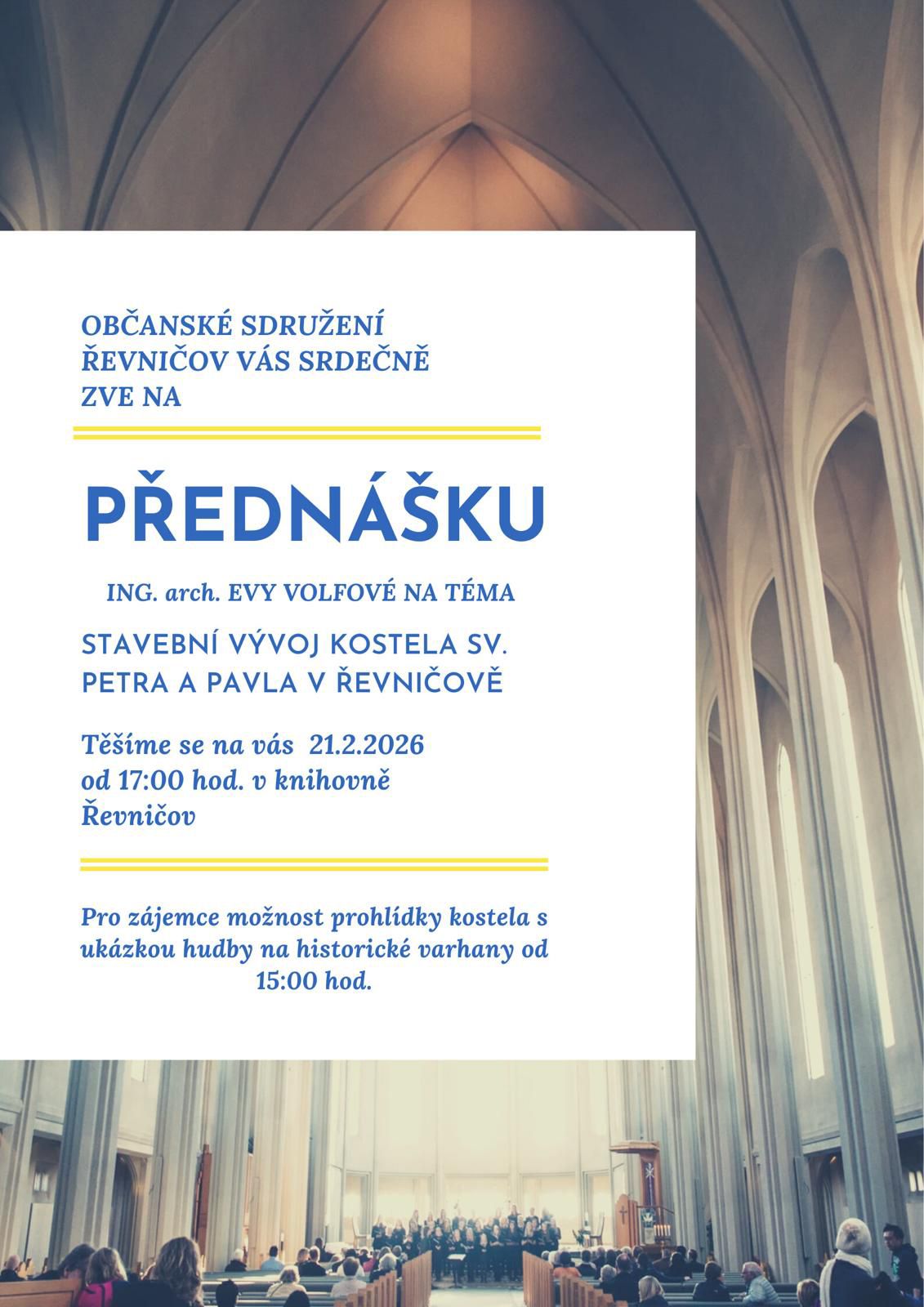 V místní knihovně v Řevničově máte tentokrát možnost poslechnout si přednášku Ing. arch. Evy Volfové, která o našem kostele zpracovala a přednesla referát na konferenci "Dějiny staveb 2014", na zámku v západočeských Nečtinách a následně i publikovala ve sborníku Dějiny staveb 2015: "Věž kostela sv. Petra a Pavla v Řevničově". Má k dispozici spousty fotografií a obrazových příloh z doby přípravy referátu, kdy se zabývala celou stavbou kostela komplexně a může tedy představit podrobnou slohovou analýzu jeho celku.
